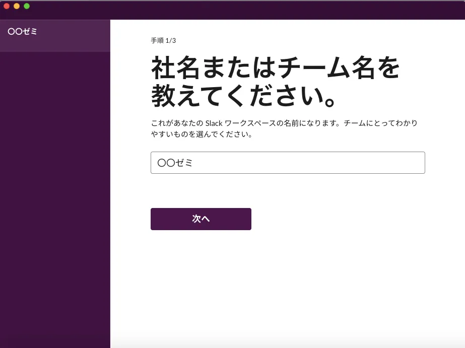 - ワークスペース(例:授業名)を設定します.「社名またはチーム名」はワークスペースの名前になります.授業で使用する場合,ワークスペース名はどの授業か一目で分かる名前にしましょう.ここでは「〇〇ゼミ」というワークスペースとします.