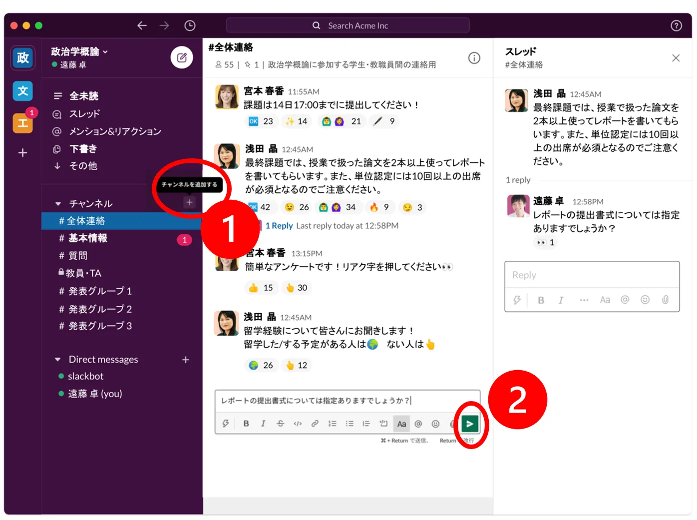 確実にレスポンスがもらえるように,教員をメンションするとよいでしょう.赤丸のようにSlackでの登録名の前に@をつけることでメンションできます.