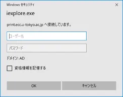AD\+ユーザ名」を,パスワード欄にはそのパスワードを入力し,「OK」ボタンを押下してください.(ECCS2021 では多くの方のユーザ名は共通ID(UTokyo Accountの先頭10桁の数字のみの部分)です)ユーザ名の例: