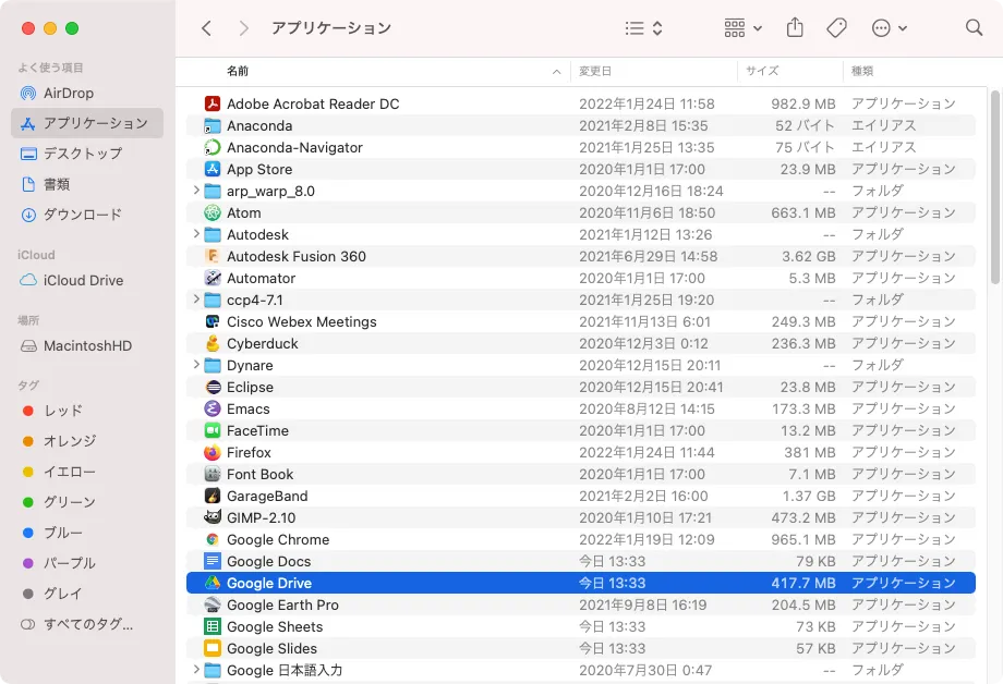 上のウィンドウが表示されない場合は,Finderで「アプリケーション」の中の「Google Drive」をクリックしてください.
