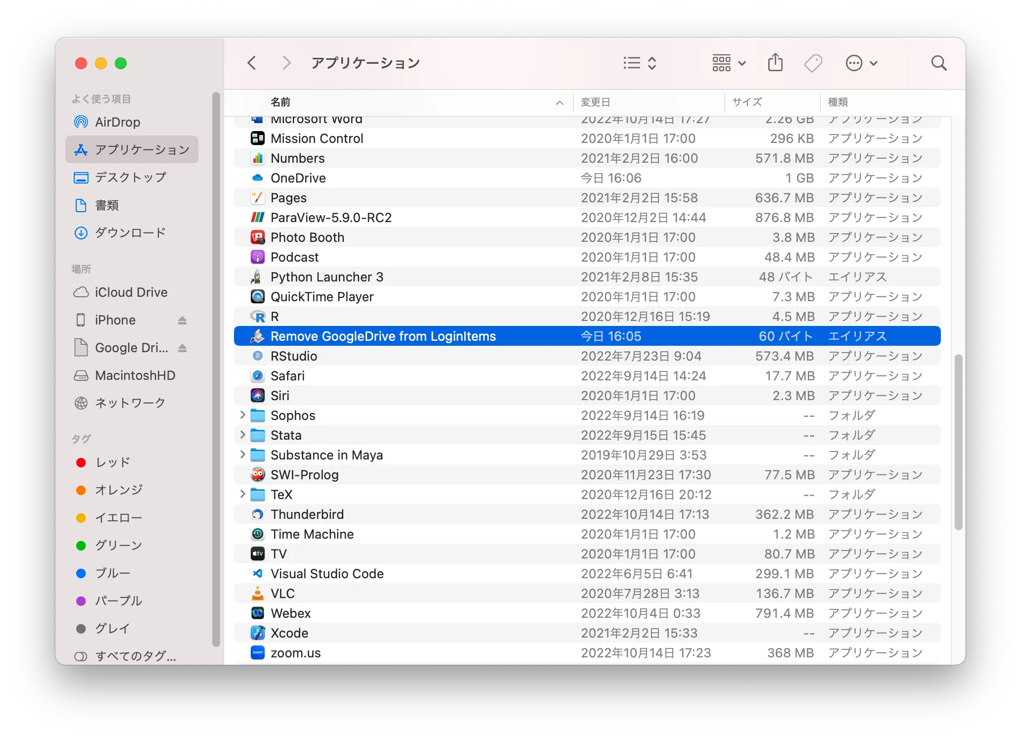 - Finderを起動し,「アプリケーション」の中の「Remove GoogleDrive from LoginItems」をクリックしてください.