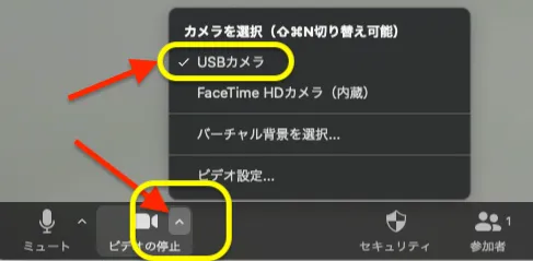 Zoomの画面左下のカメラのアイコン右側の「^」印を左クリックすると「カメラを選択」の画面が表示されます.表示されるカメラの中から,該当するものを選択すると,USB接続のカメラを使うことができます.