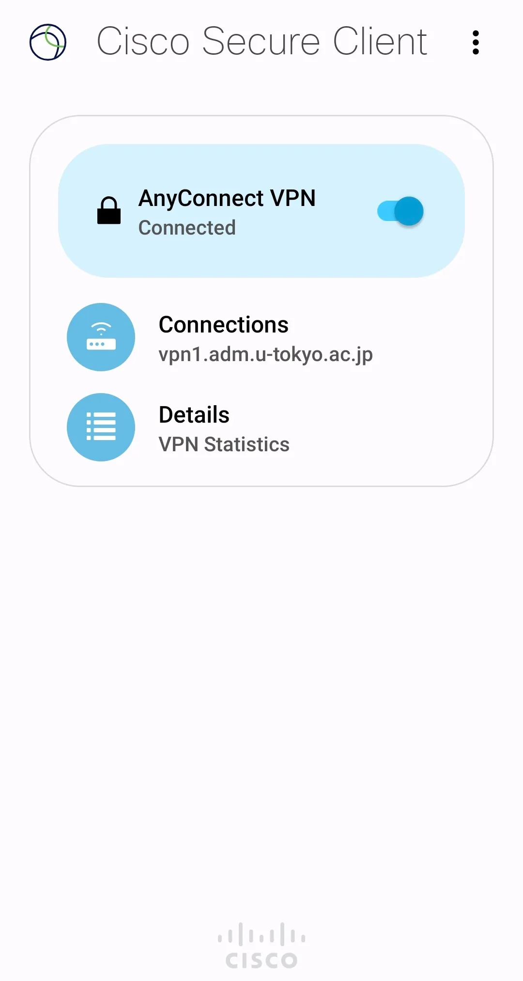 Step G: Your device is connected to the UTokyo VPN if “Connected” is displayed on the Secure Client app screen as shown below.