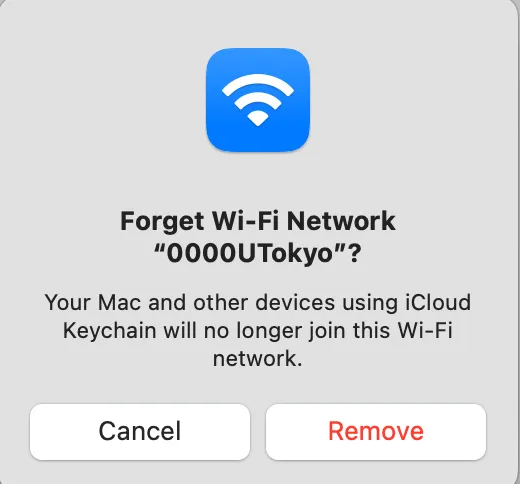 If the screen for entering a Account name and a password does not appear in Step 2 and it fails to connect to the Wi-Fi, you need to delete the existing setting and register a new one. This is necessary because although once you reissue your account and your previous account becomes invalid, your devices may still store it. Before using the new account, your devices must “forget” the previous one. There is no need to worry about never being able to connect to the UTokyo Wi-Fi again upon “deleting” a account.Select the SSID found in Step 2 and then select “Forget This Network” on the displayed screen. When a screen asking “Forget Wi‑Fi “0000UTokyo”?” appears, select “Remove”.
