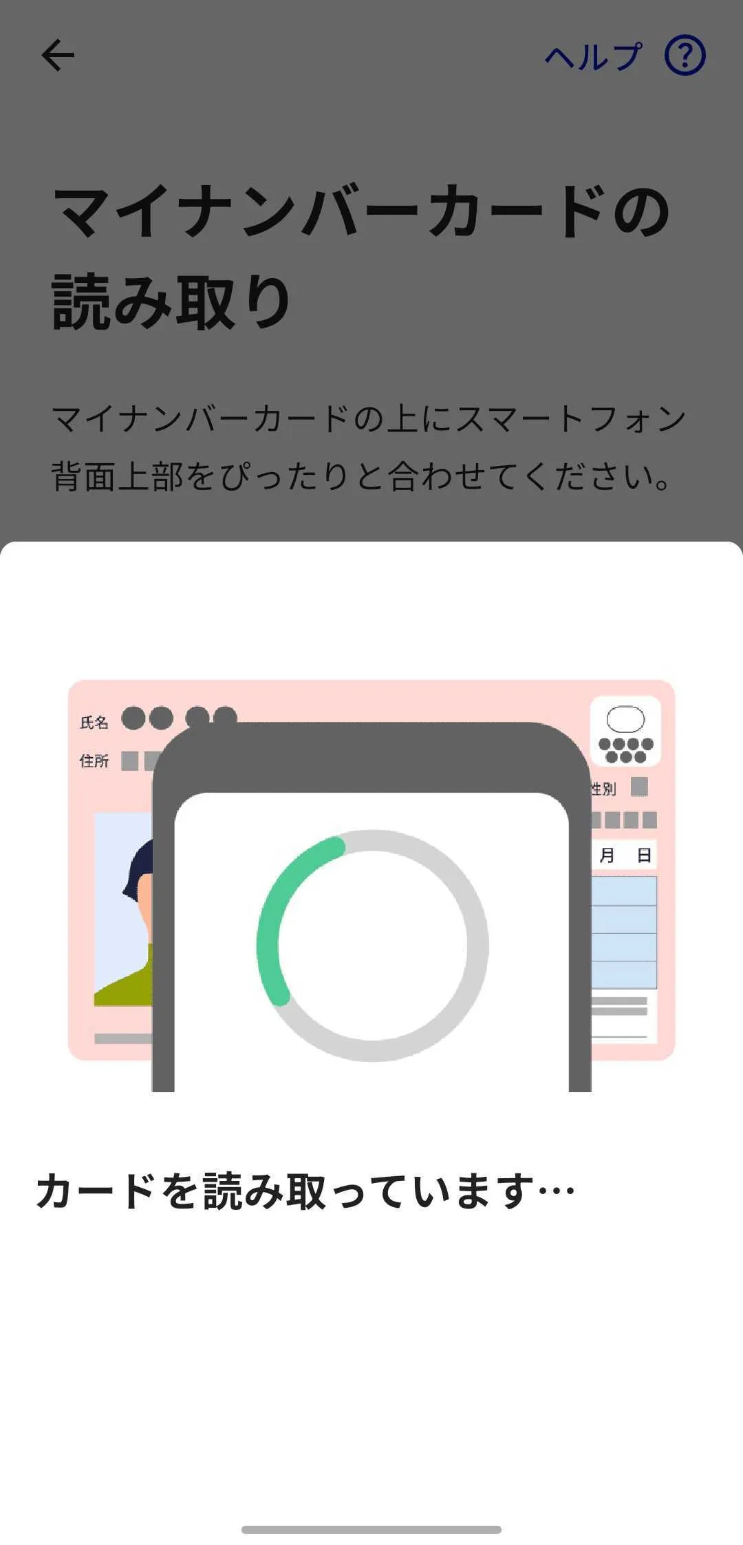 - 「カードを読み取っています…」と表示されている間は,マイナンバーカードをスマートフォンから離さないでください.