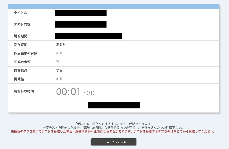 • 解答待ち時間があるテストの場合,「待ち時間スキップ」を押すと待ち時間がなくなり「受験する」が表示されます.