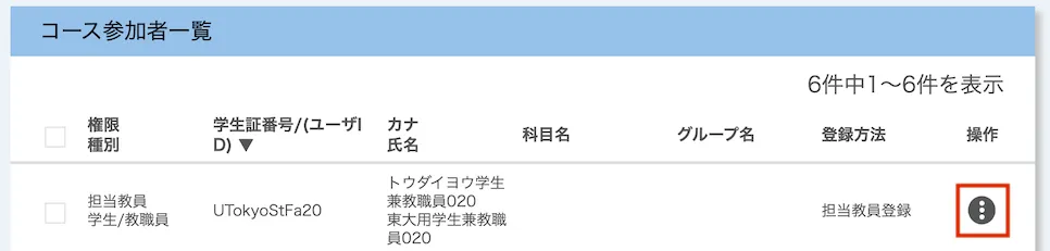 - 「コース参加者一覧」の右端にある「操作」列の「