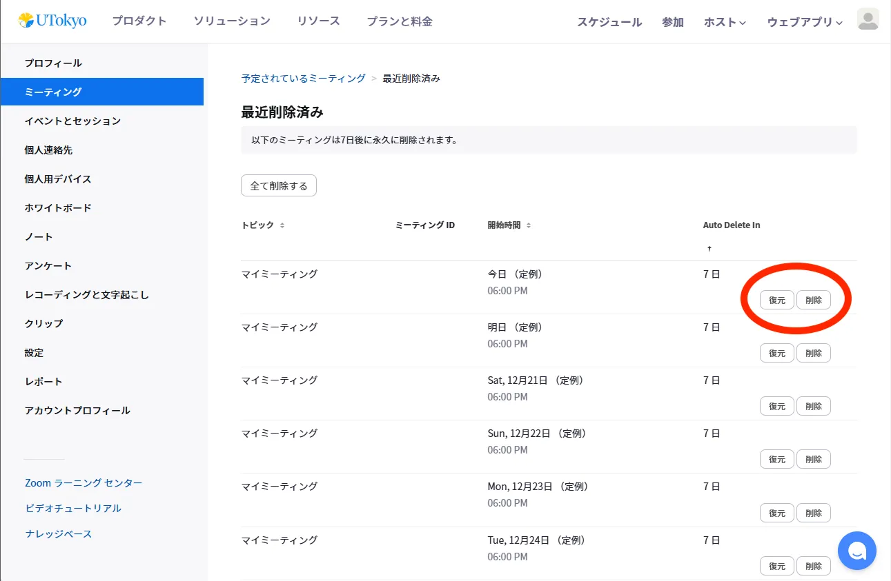 7日以内に削除されたミーティングについてできる操作は以下の通りです.