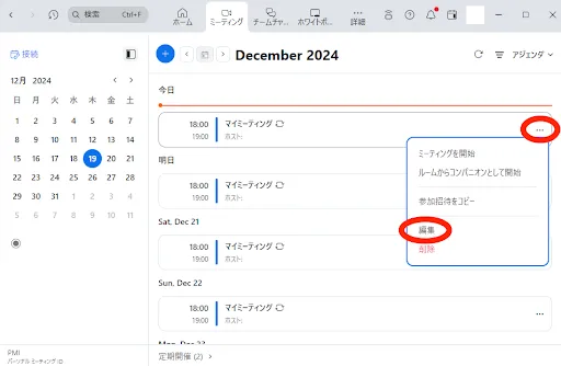 なお,同様の操作はブラウザだけでなく,アプリでも行えます.「ミーティング」タブを選択し,当該のミーティングの「…」のアイコンを選択すると,「編集」の項目が出てきます.