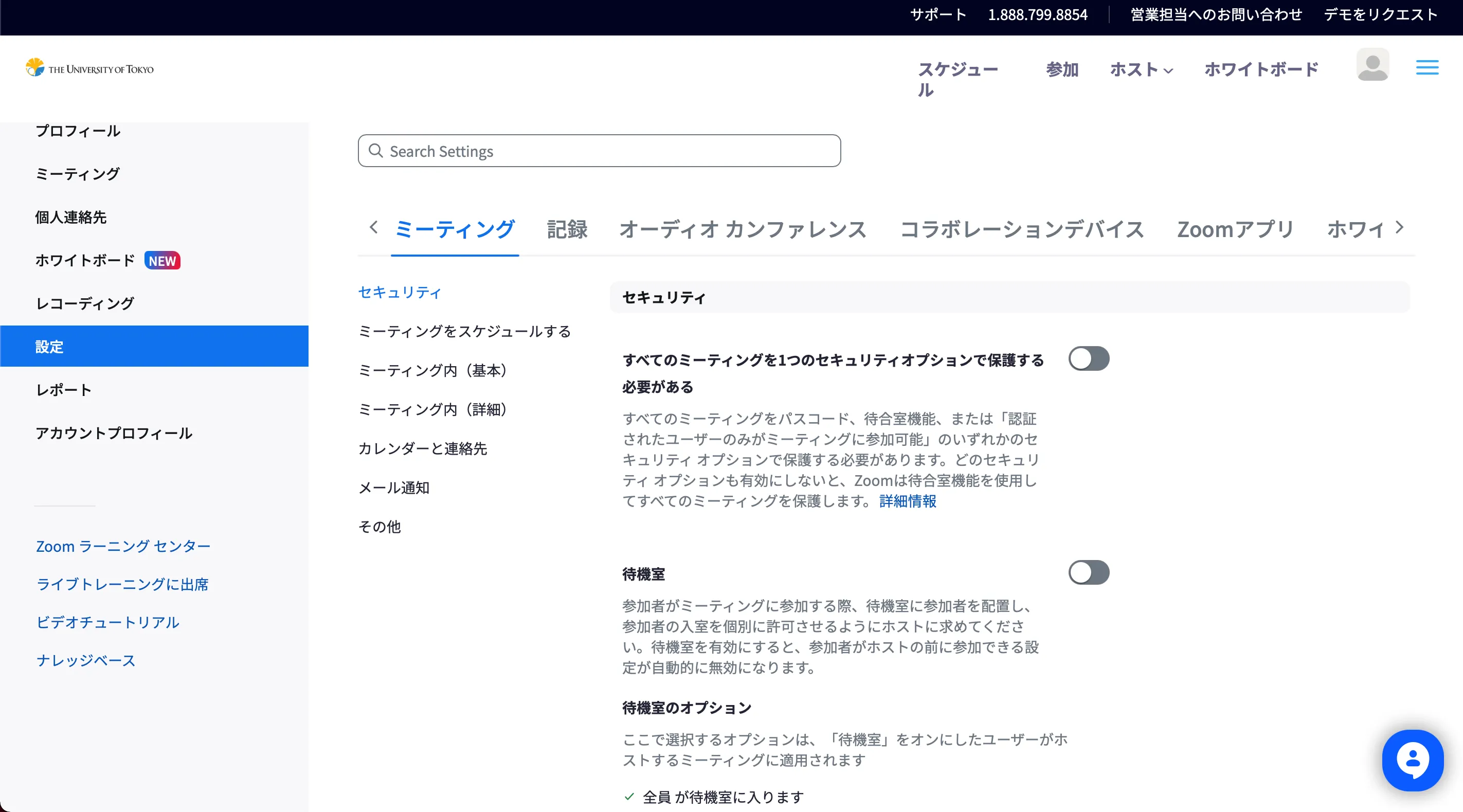 - 画像のような設定画面が表示されていることが確認できたら,「ミーティング内(基本)」の中の「画面共有」の項目までスクロールしてください.
